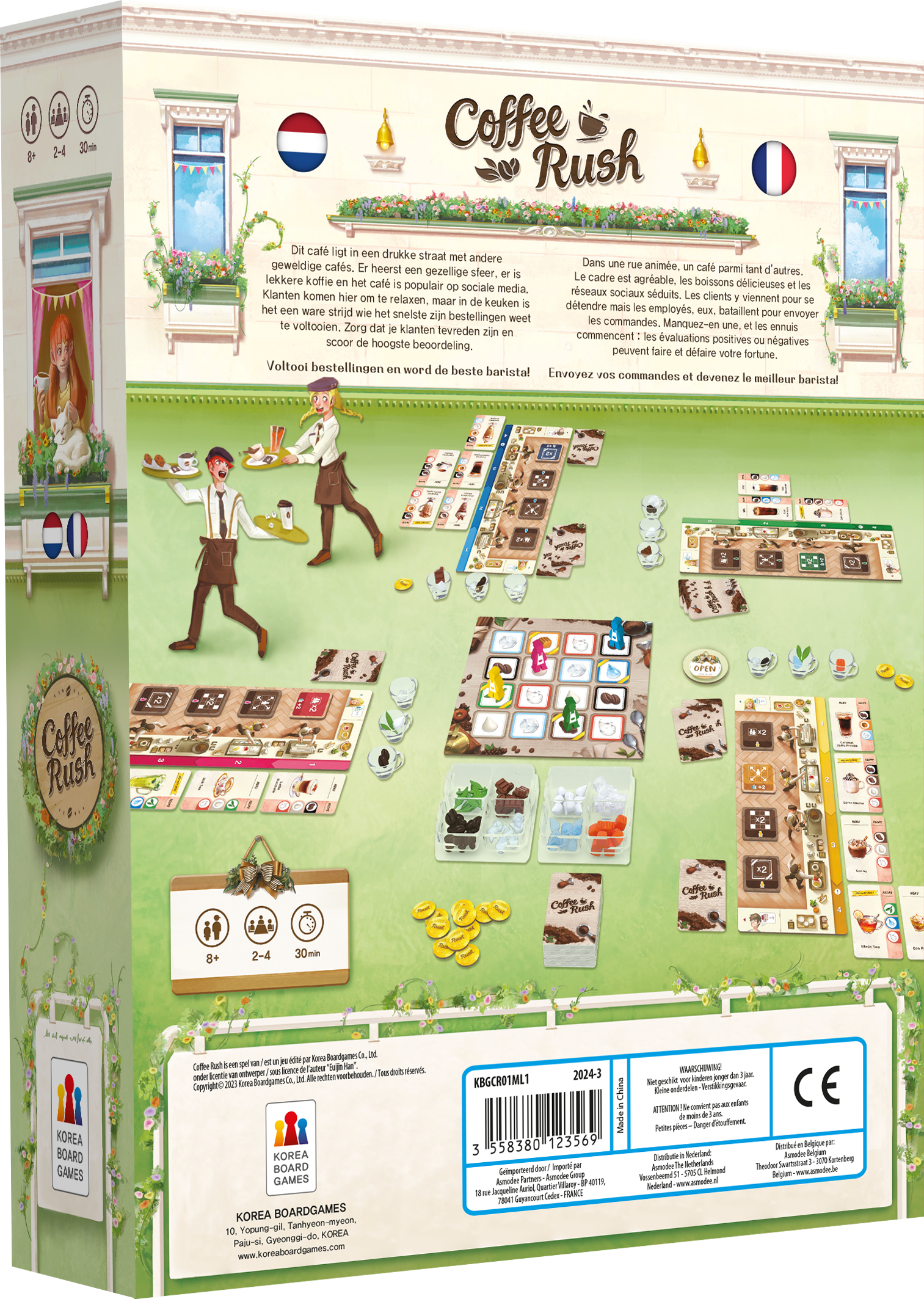 Coffee Rush is een tactisch bordspel waarin spelers in de huid kruipen van barista’s in een druk café. Terwijl klanten genieten van hun koffie, probeer jij razendsnel de juiste ingrediënten te verzamelen en bestellingen af te ronden. Wie de meeste positieve beoordelingen scoort, wint het spel.