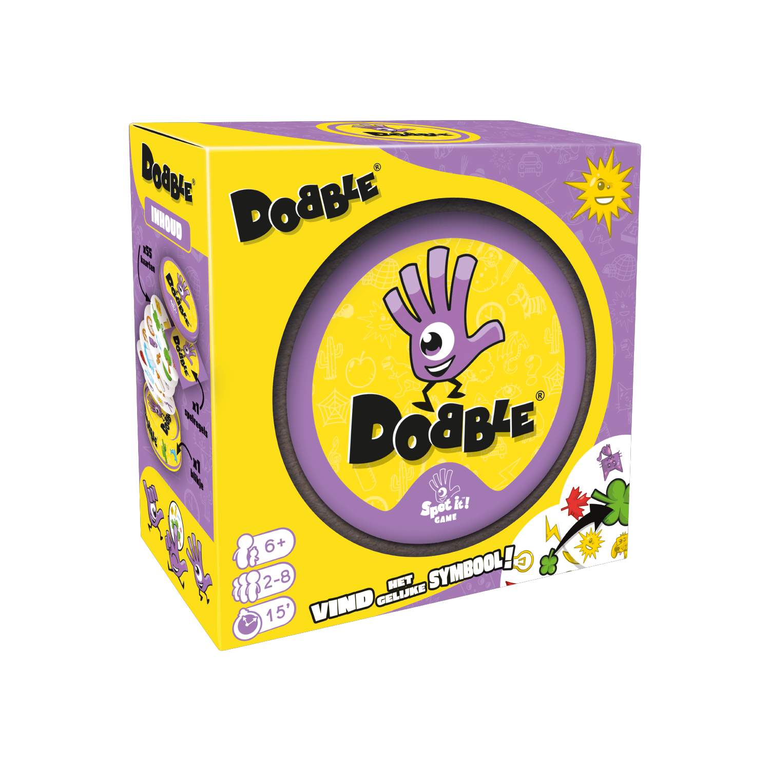 Dobble Classic bevat 55 kleurrijke kaarten, elk met 8 verschillende symbolen zoals een sneeuwpop, bliksemschicht, hart of dolfijn. Tussen elke twee kaarten is altijd precies één symbool hetzelfde – maar zie jij het ook als eerste? Oefen je ogen en wees je tegenstanders te snel af!