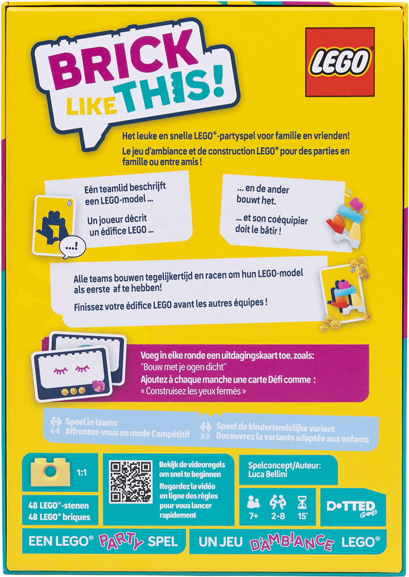 Brick Like This! is een partyspel waarin samenwerking, snelheid en creativiteit centraal staan. Spelers werken in teams van twee. Terwijl de ene speler een LEGO-model beschrijft, probeert de andere het zo snel mogelijk na te bouwen. Het resultaat? Veel gelach, soms wat frustratie, maar vooral heel veel plezier!