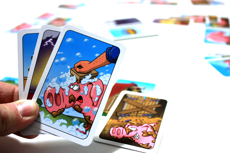 In ‘Moddervarkens’ probeert iedere speler zijn varkens te laten spelen in de modder om ze lekker vies te maken. Maar pas op, want je tegenstanders zullen alles in het werk stellen om jouw varkens weer schoon te wassen. Een stal komt dus goed van pas, want een dak biedt sowieso bescherming tegen regenkaarten. En als je de deur dan ook nog eens dicht laat timmeren, dan kan geen boer binnenkomen om jouw varkens schoon te boenen. De speler die uiteindelijk alleen maar moddervarkens voor zich op tafel heeft liggen, wint het spel! Dus ga dat varkentje van je tegenstanders maar eens wassen!